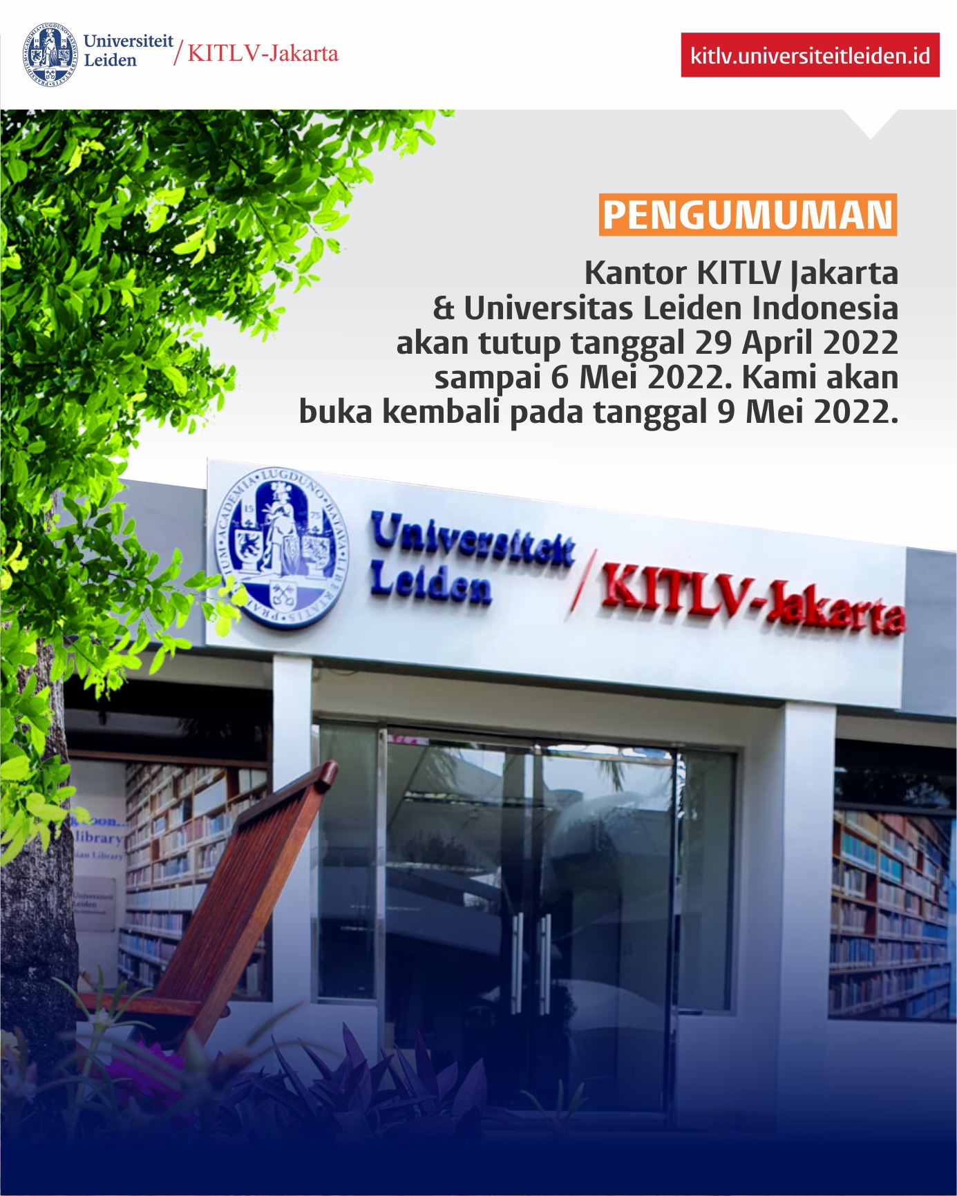 Dalam rangka memperingati hari raya Idul Fitri, kantor KITLV Jakarta dan Universitas Leiden di Indonesia akan tutup tanggal 29 April 2022 sampai dengan 6 Mei 2022. Kami akan buka kembali pada tanggal 9 Mei 2022.