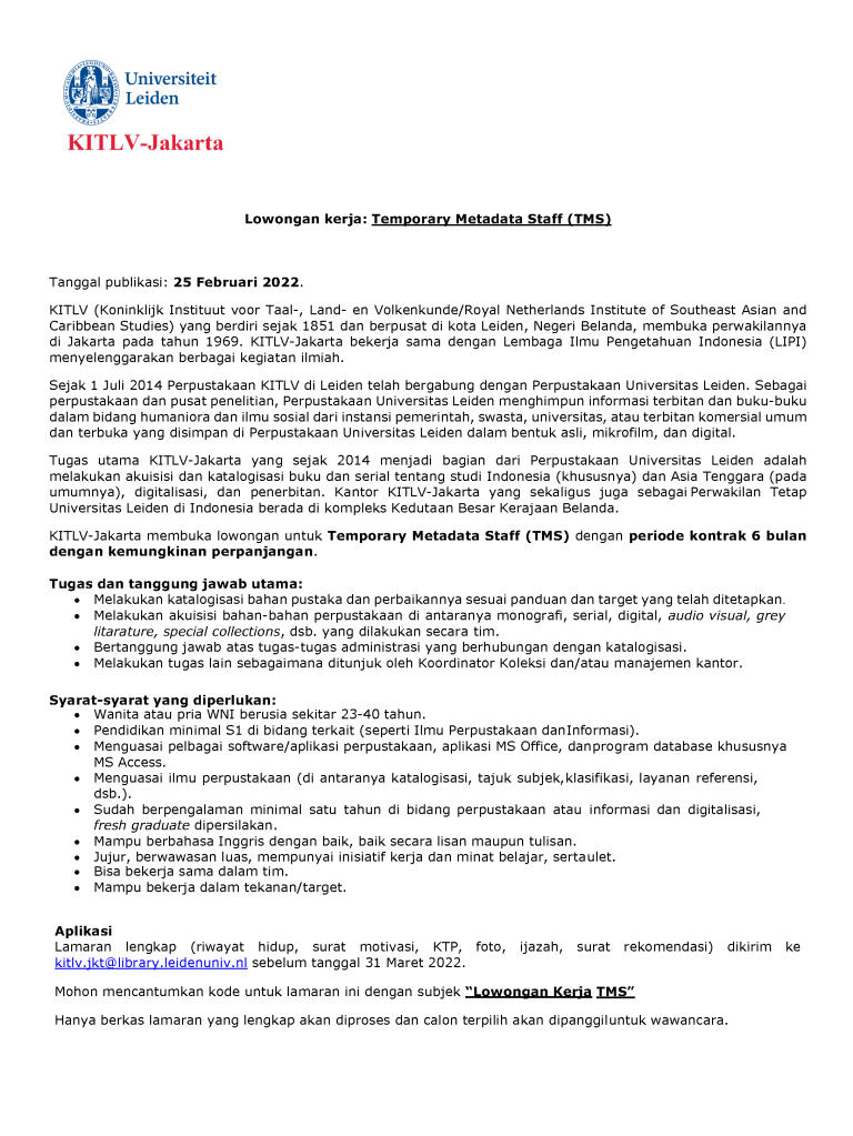 Lowongan kerja: Temporary Metadata Staff (TMS)